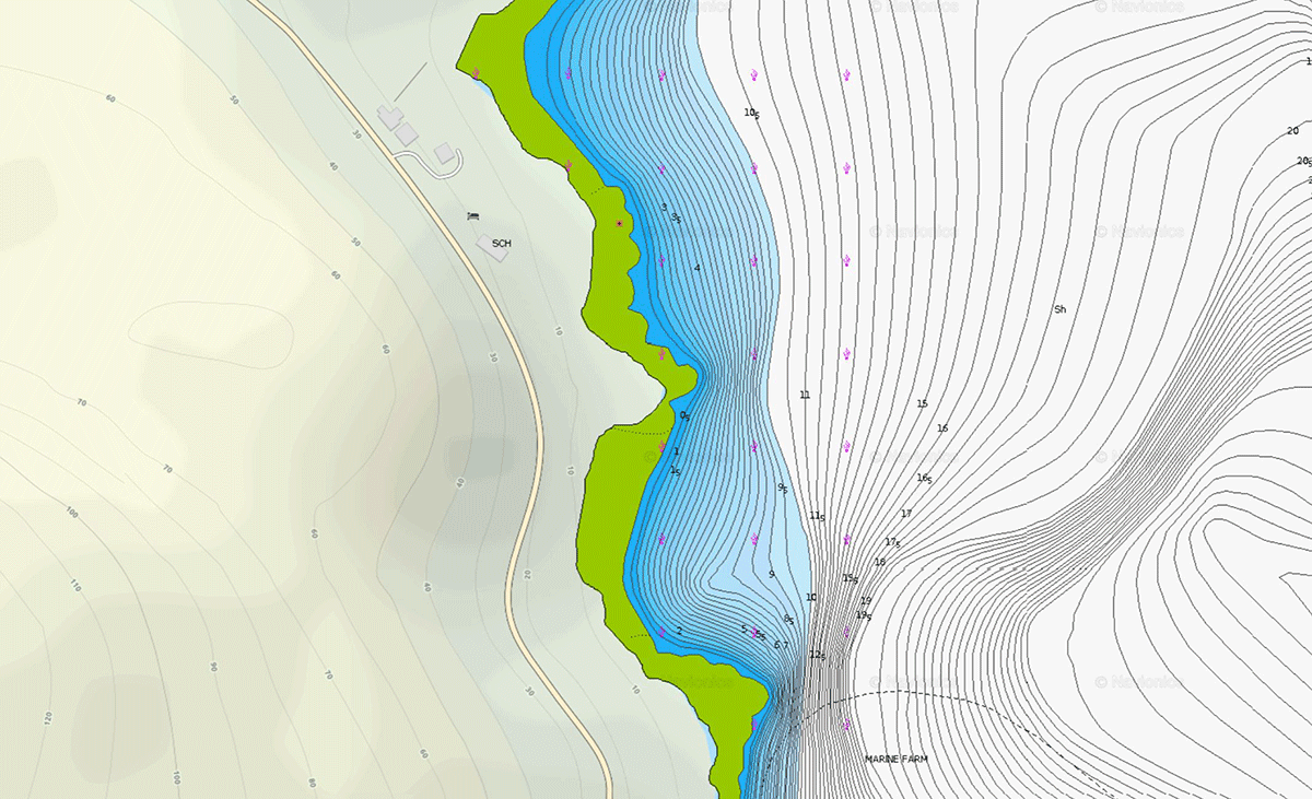 I like the detail that the Sonarchart version and usually use it with the satellite overlay which helps with establishing a location. The contours on the chart allow features to be clearly indicated in the search for a new shore mark. The charts also give a basic indication of the seabed although this is general in nature. Prominent rocks and obstructions near to the surface are distinctly marked.