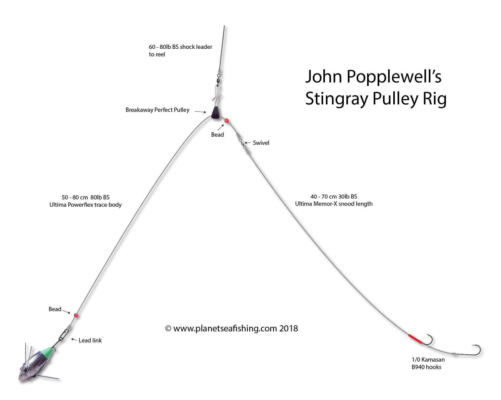 This stingray rig is designed to fish a large ragworm bait for stingray, the 1/0 hooks may seem on the small side but the stingray has a comparatively small mouth for its size.