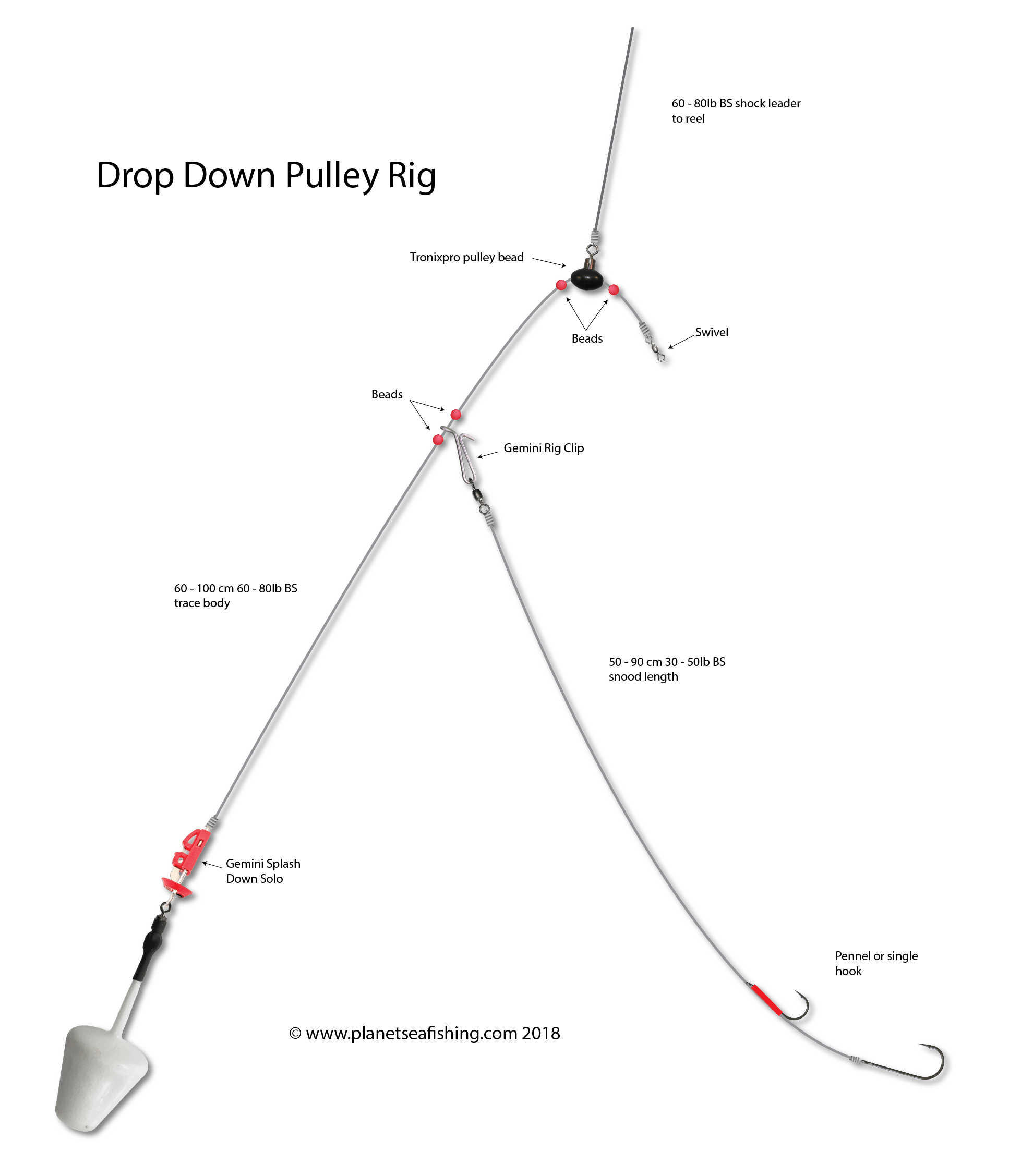 The principal behind the pulley drop down rig is that on impact with the sea the Gemini rig swivel will release and the trace will slide down the rig body to allow the baits to rest on the seabed. If using a grip lead the line should be tightened before hitting the seabed to ensure the hook or hooks flow away from the rig body. With a plain lead the rig can be moved after settling to obtain the same effect.