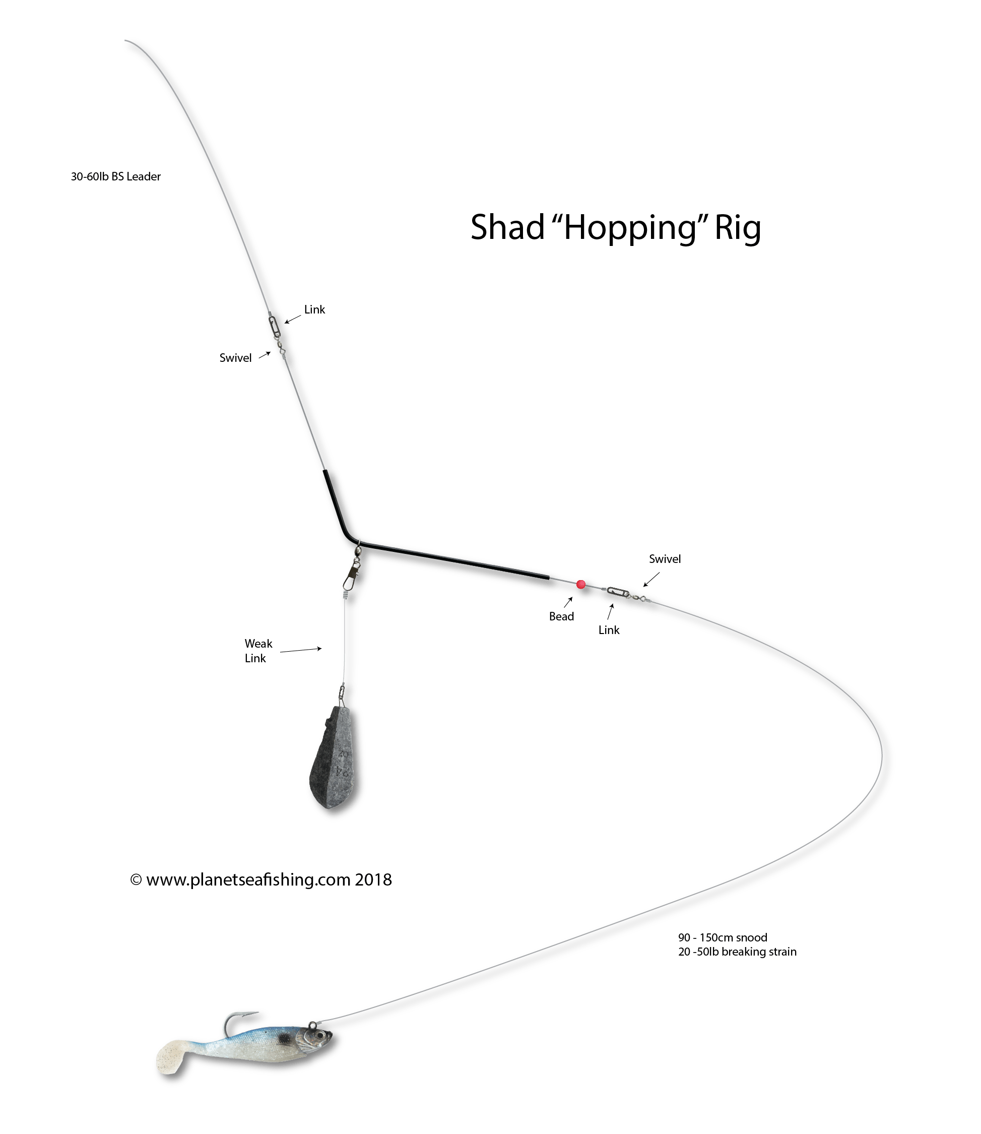 This hopping or shad rig is used close to the seabed to “hop” the plastic lure along using short, controlled lifts and drops.