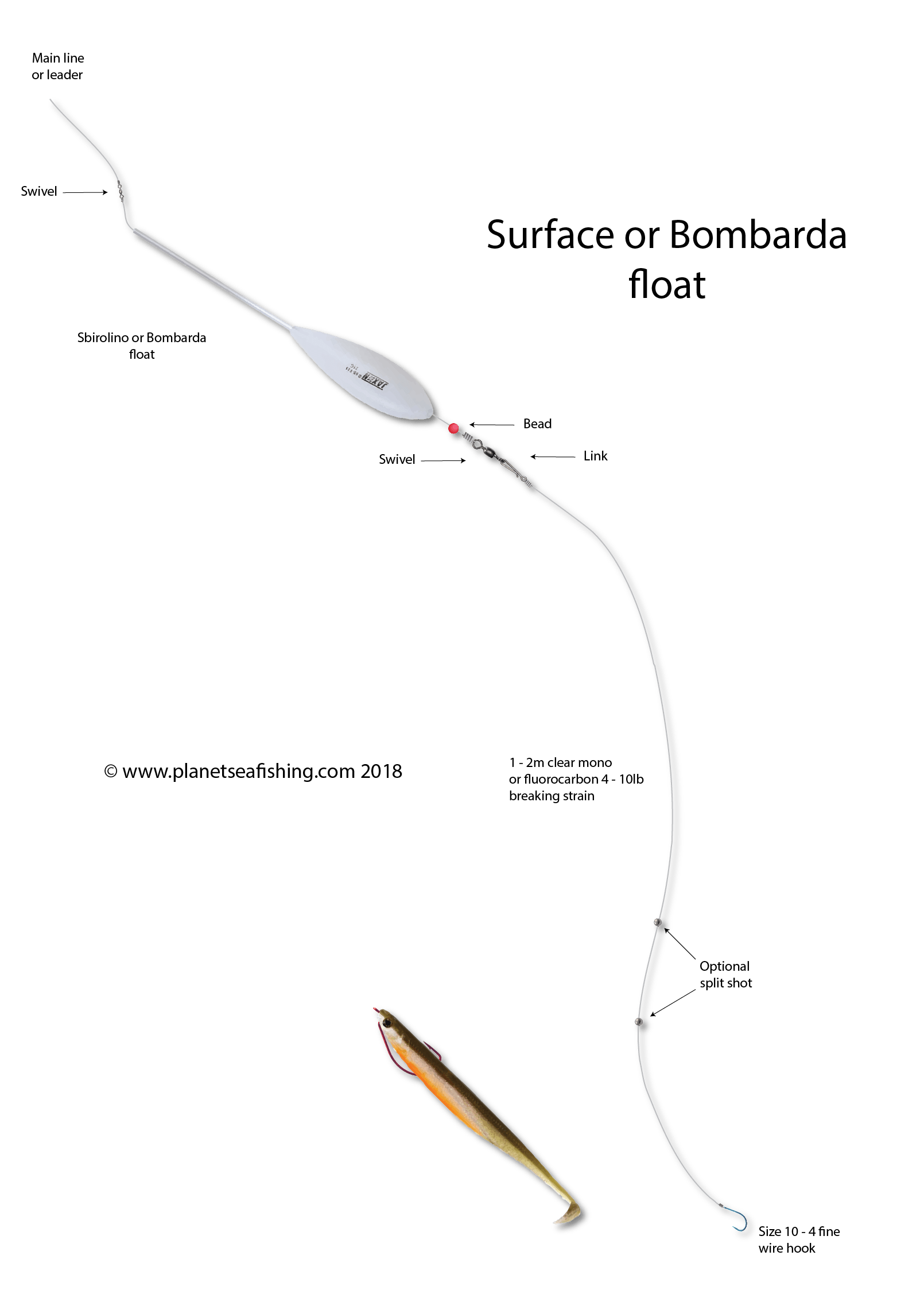 The surface float is used to present a bait in the top layer of the water and is suitable for mullet, garfish and mackerel. Common names for this style of float are sbirolino and bombarda.