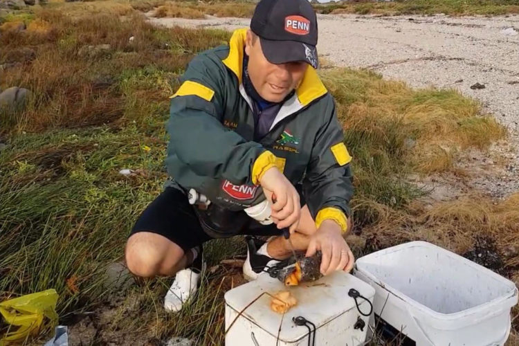 A first for me seeing red bait or sea squirt in use as a bait off the South Africa coastline. The cracker or black musselcracker is a hefty inshore species that can grow to 40kg.